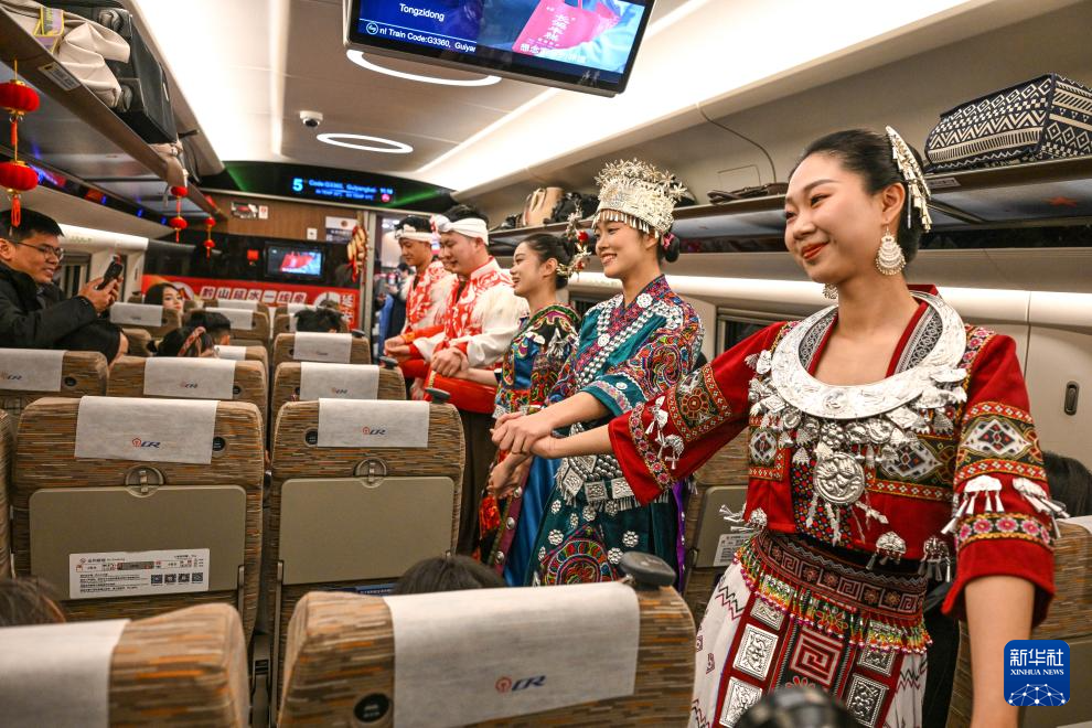 1月26日,青年志愿者在遵义开往延安方向的G3360次列车上给旅客表演节目。新华社记者 杨文斌 摄
